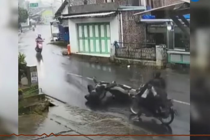 Gridmotor.id - Waspada, video pemotor terpeleset saat riding dalam kondisi hujan deras, pemotor lain jadi korbannya.