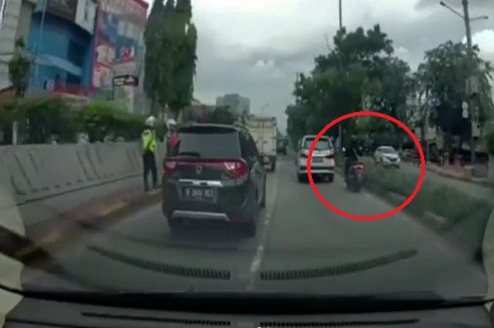 Tahu ada polisi di depannya, pemotor itu langsung beralih ke sisi kanan mobil.