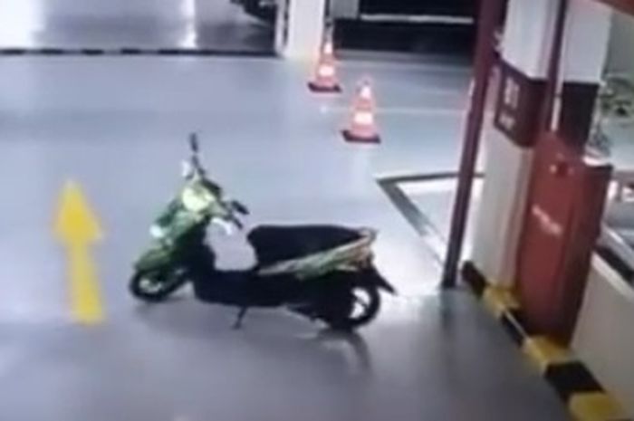 Pada video itu terlihat seorang pemotor menunggangi Yamaha Mio di sebuah parkiran basement.