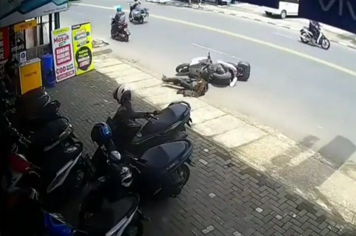 Nahasnya, jatuhnya pemotor itu sampai mengenai orang berkebutuhan khusus.