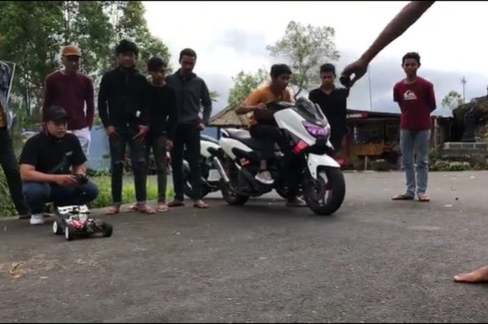 Dalam video tersebut, terlihat Yamaha NMAX berwarna putih yang ingin beradu cepat akselerasi dengan mobil RC.