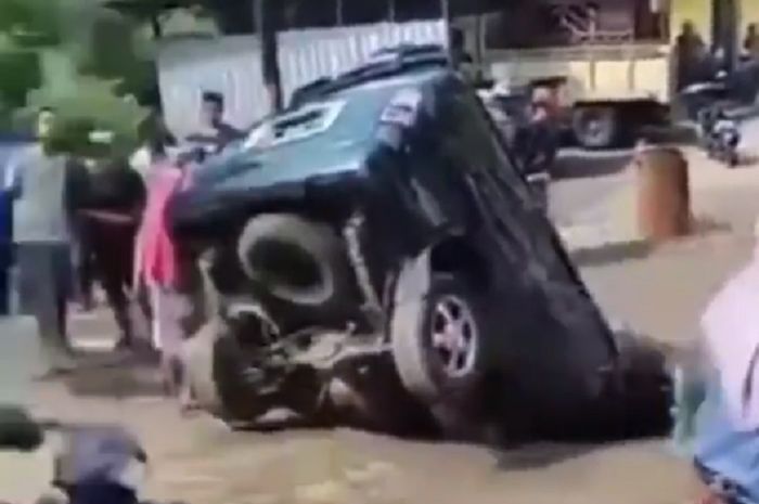 Video mobil masuk lubang jalan diunggah akun Instagram @ndorobeii.