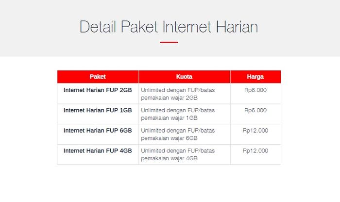 Berikut ini detail paket internet harian.