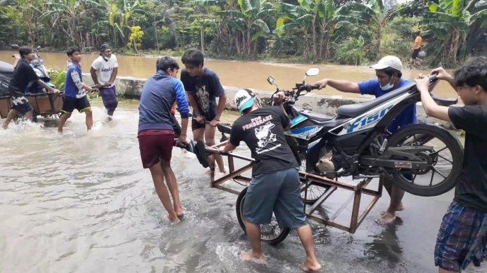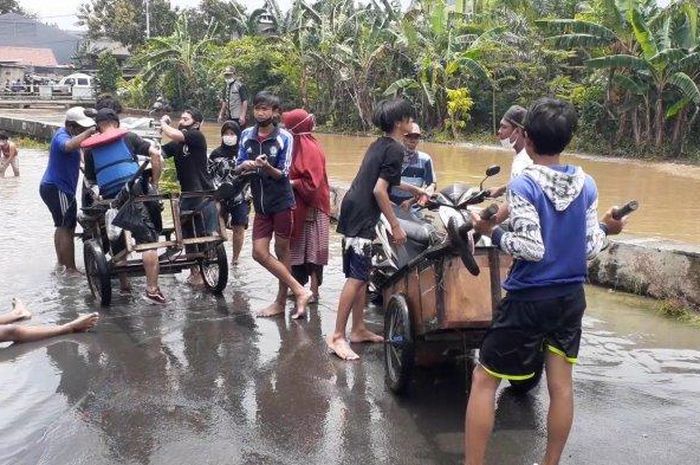 Sehingga beberapa lompok pemuda justru memanfaatkan untuk mengais rezeki dari pemotor yang hendak melintas jalur yang sedang banjir.
