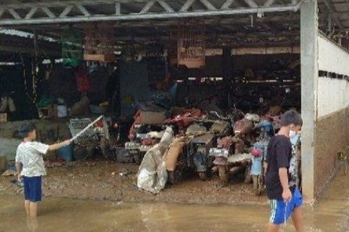 GridMotor.id - Ratusan motor diselimuti lumpur tebal setelah banjir di Jatipadang, Jakarta Selatan surut.