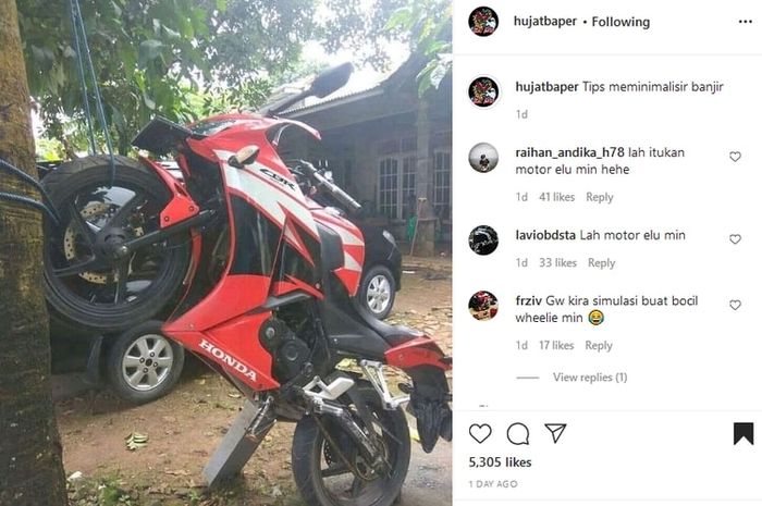Kali ini dikutip dari akun Instagram @hujatbaper, terlihat motor Honda CBR digantung sampai nukik di pohon.