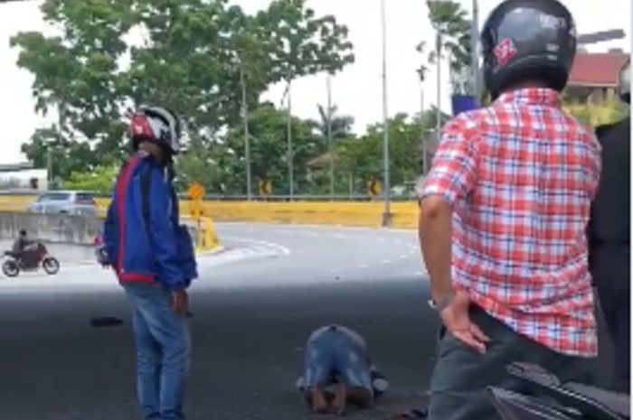 Melihat hal tersebut, beberapa pemotor terlihat langsung menjaga pria tersebut.