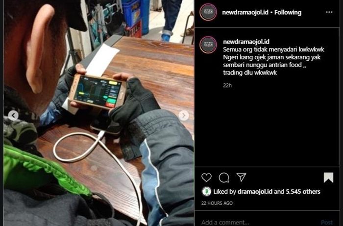 "Semua orang tidak menyadari wkwkwk ngeri kang ojek jaman sekarang yak. Sembari nunggu antrian food, trading dulu wkwkwk" tulis captionnya.