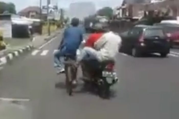 Gak cuma goyang oleng diatas motor, pemotor tersebut sampai tendang pesepeda.