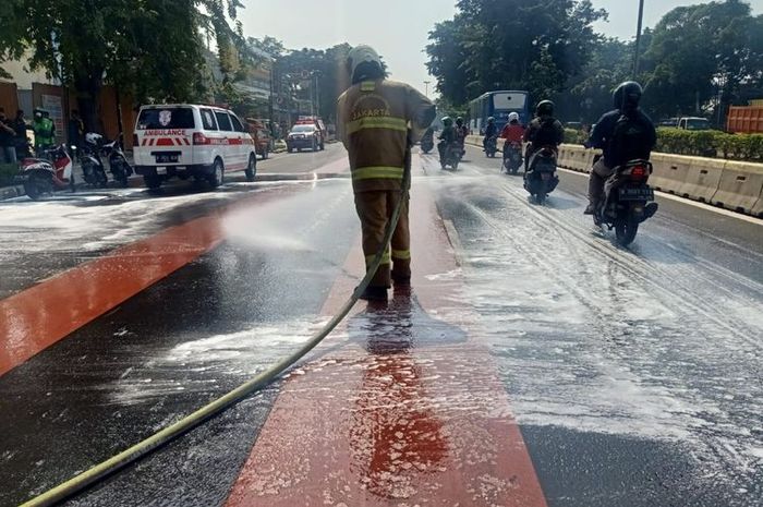 "Tumpahan minyak goreng sepanjang 50 meter," kata Kasie Ops Sudin Gulkarmat Jakarta Timur, Gatot Sulaiman.
