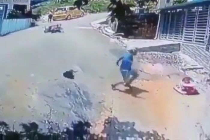 Melihat kejadian itu, pemotor pun langsung meninggalkan motornya dan menyelamatkan balita tersebut.