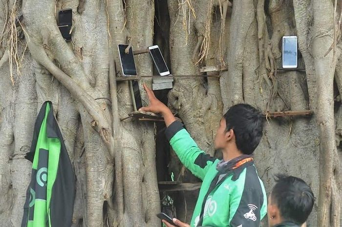 Beberapa ponsel terlihat ditaruh di sebuah pohon beringin besar.