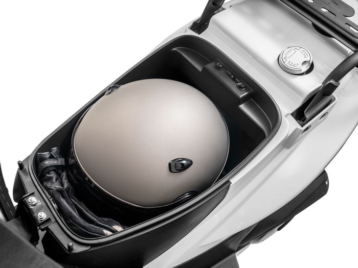 Terdapat juga bagasi berukuran 6 liter di bawah jok, muat untuk satu helm half face dan sarung tangan.