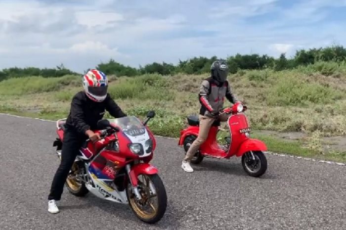 Banyak diunggah di Instagram video Vespa Primavera ET3 melawan motor sport Honda NSR 150 SP.
