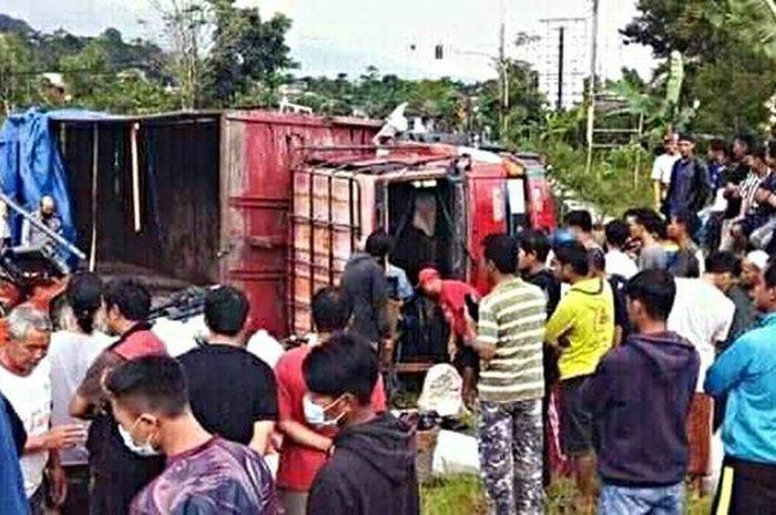 Tronton itu kemudian mengalami pecah ban hingga lajunya tidak terkendali.