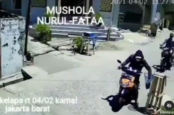 Enggak cuma berhenti, pemotor itu langsung memasukan tangannya ke jaring dan mengambil uang amal Mushola.
