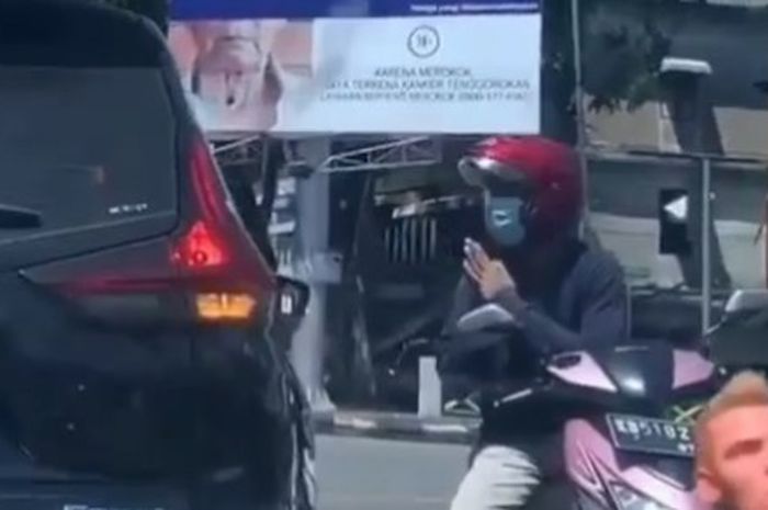 Pemotor tersebut memutar balik ke arah pintu sopir Xpander, kemudian terlihat meminta maaf.