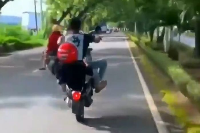 Mereka menunjukan aksi freestyle wheelie di tengah jalan.