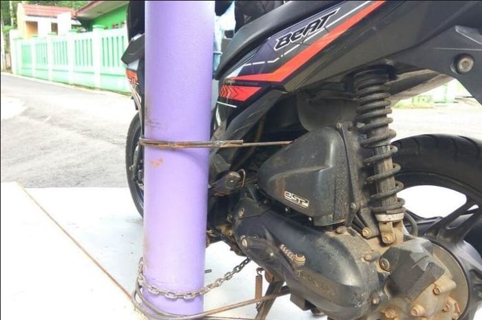 Gridmotor.id - Orangnya kabur, motor milik diduga pelaku pencurian dilas ke tiang listrik.