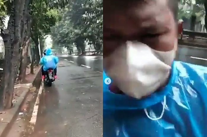 Pada video pertama, terlihat pelaku berboncengan motor tanpa plat nomor sambil memakai jas hujan.