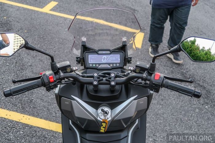 Instrumen clusternya menggunakan layar digital LCD, windshield depan bisa diatur secara manual, mirip Honda ADV 150.