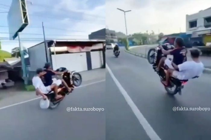 Gridmotor.id - Bikin geger, anak muda naik motor wheelie sambil boncengan.