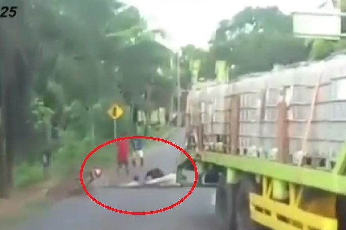 Pada video, terlihat pemotor berhenti akibat ada truk yang terperosok.