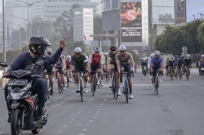 Dalam foto, pemotor berplat AA berkendara di depan para rombongan pesepeda.