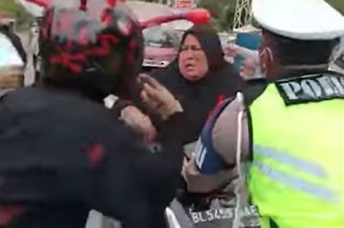 Polisi yang berada dilokasi pun langsung menghentikan laju kendaraan emak-emak tersebut.