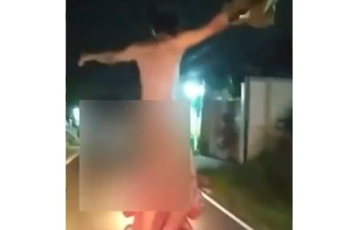 Hanya memakai pakaian dalam, pemudah tersebut teriak-teriak diatas motor.
