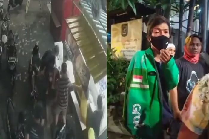 Terlihat seorang pria yang merupakan driver ojol dikeroyok sejumlah pemuda di depan rumah makan.