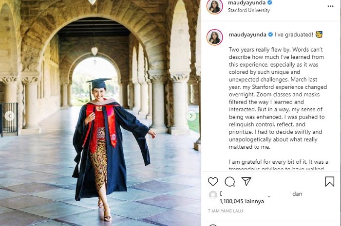 "Saya sudah lulus! Dua tahun benar-benar berlalu. Kata-kata tidak bisa menggambarkan berapa banyak yang sudah saya pelajari dari pengalaman ini, terutama karena diwarnai oleh tantangan yang unik dan tak terduga," tulis Maudy.