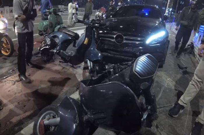 Terlihat ada sebuah mobil sedan mewah telah menabrak motor-motor yang ada di pinggir jalan.