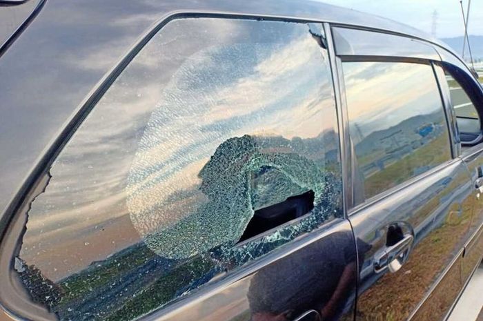 Akibatnya, kaca mobil Daihatsu Xenia berpelat AB 1534 QG rusak.