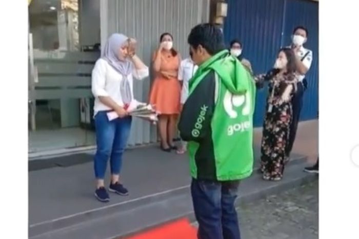 Gridmotor.id - Pakai karpet merah, driver ojol lamar kekasih di depan bank.