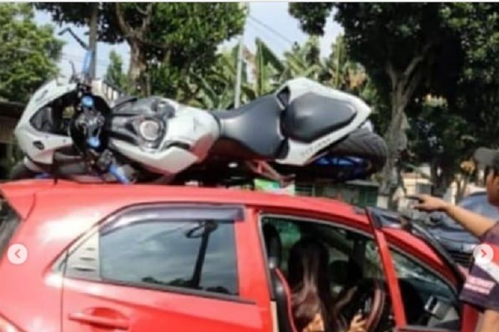Di atap mobil, nampak sebuah motor Honda CBR250RR tergeletak.