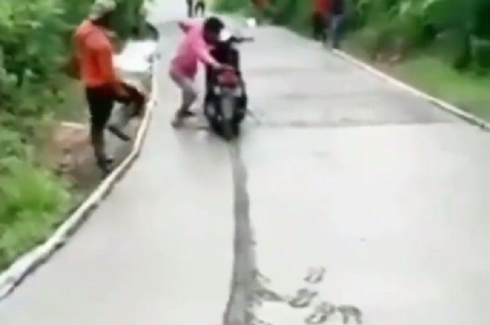Pada video, terlihat pemotor Honda BeAT berhenti di tengah jalan yang lagi dicor.