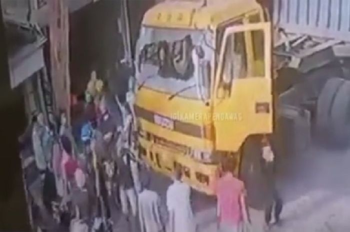 Dari video, melaju truk kontainer warna kuning dari arah sebelah kanan jalan dan mendadak terhenti akibat rombongan pengantar jenazah merangsek maju.