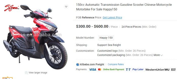Happy 125 ini terlihat dijual di salah situs marketplace online yaitu Alibaba.com.
