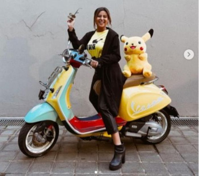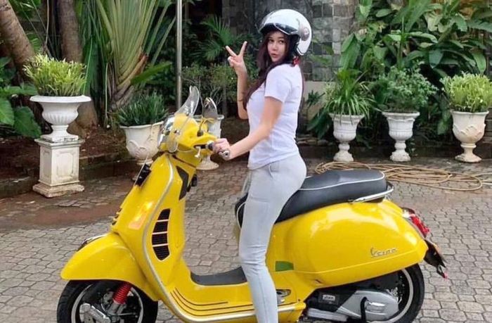 Aura Kasih membagikan potret cantiknya bersama vespa GTS 1500 warna kuning di Instagram pribadi miliknya.