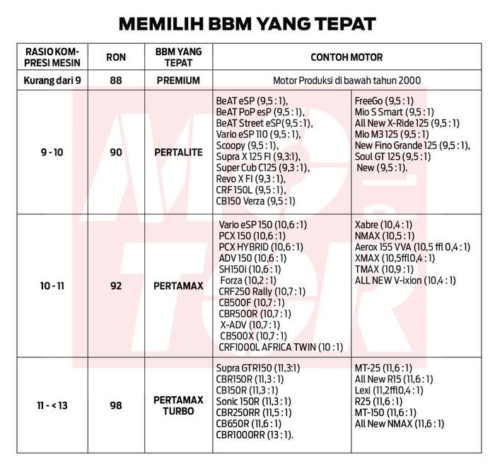 Tabel ini berdasarkan acuan rasio kompresi masing-masing mesin motor dan dilengkapi dengan jenis bahan bakar yang dijual Pertamina.