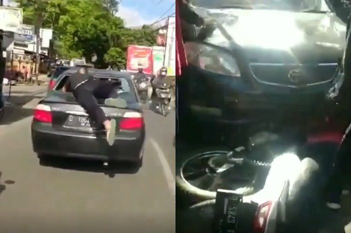 Saat perekam menyalip mobil dari kanan, terlihat sebuah motor nyangkut bumper depan dan terseret.