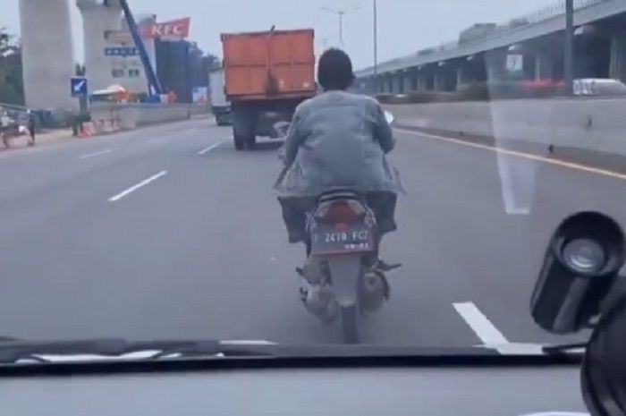 MOTOR Plus-online.com - Lagi-lagi pemotor Honda BeAT ngasal masuk jalan tol Jakarta-Cikampek, santuy banget enggak pakai helm.