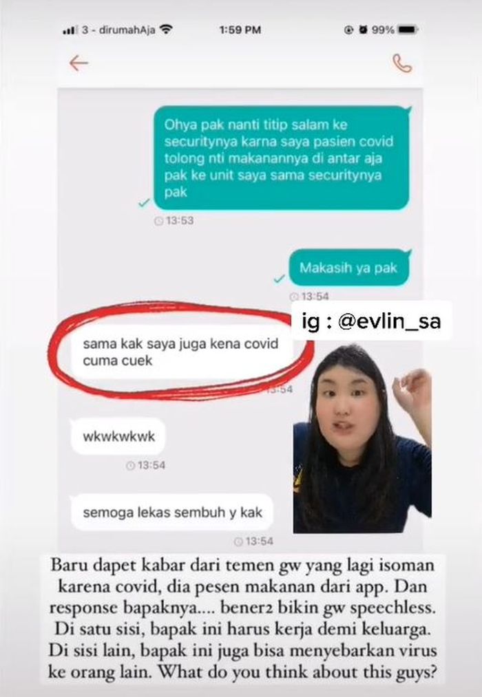 "Nah, di satu sisi gua paham banget dilema bapaknya yang harus provide buat family-nya. Tapi di sisi lain juga harus sadar kalau kalian positif dan tetap ambil orderan atau melakukan hal lain, itu akan menyebarkan ke lebih banyak orang," curhatnya.
