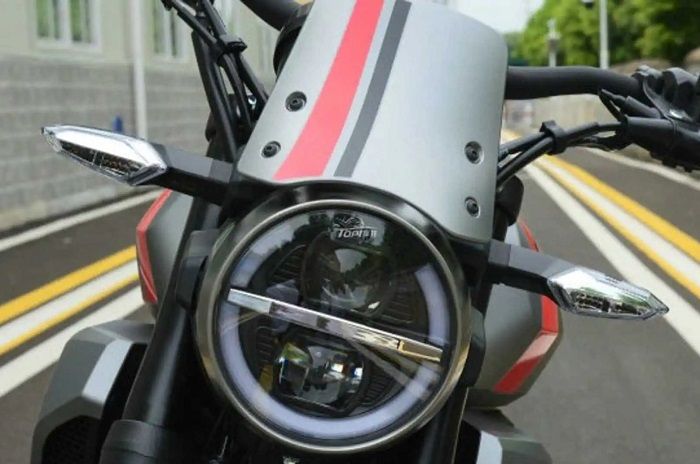 Bisa dilihat dari desain headlamp bulat klasik, tangki bensin kekar, dan jok ala motor retro.