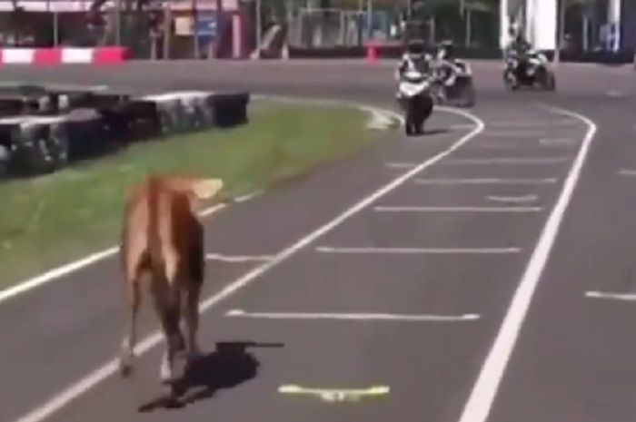 GridMotor.id - Kocak, sapi lepas pengin ikut latihan balap motor di sirkuit Sentul Karting, dikejar sampai nyungsep.