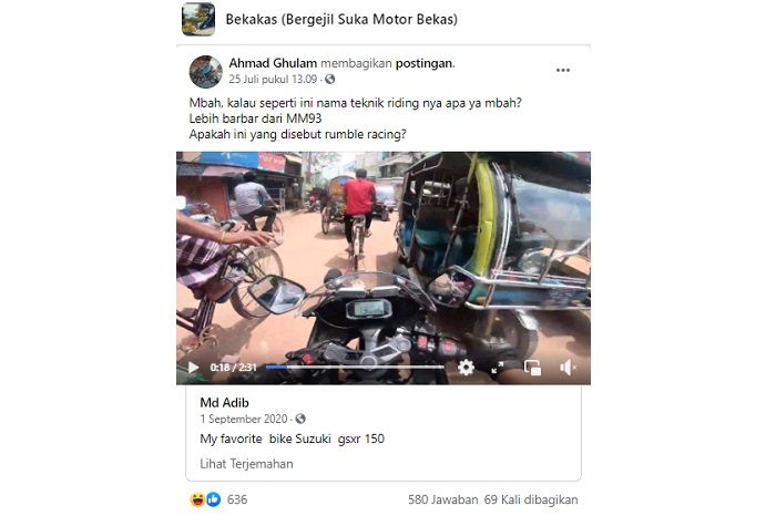 Sebuah video dibagikan akun Facebook Ahmad Ghulam ke grup Bekakas (Bergejil Suka Motor Bekas).