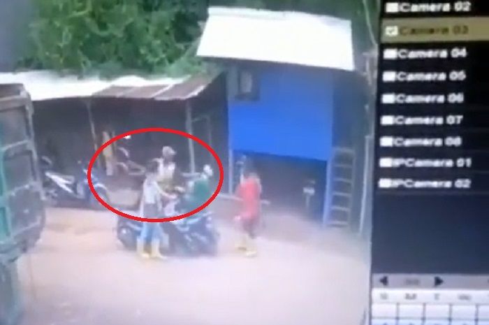 Tiba-tiba dari sebelah kiri, datang motor yang dinaiki dua orang, menyerempet pemotor matic tadi.