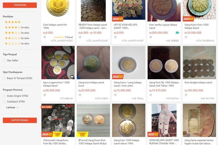 Dari pantauan terbaru MOTOR Plus di toko online, harga uang koin Rp 1.000 bergambar kelapa sawit ini harganya tembus Rp 100 juta per bijinya!