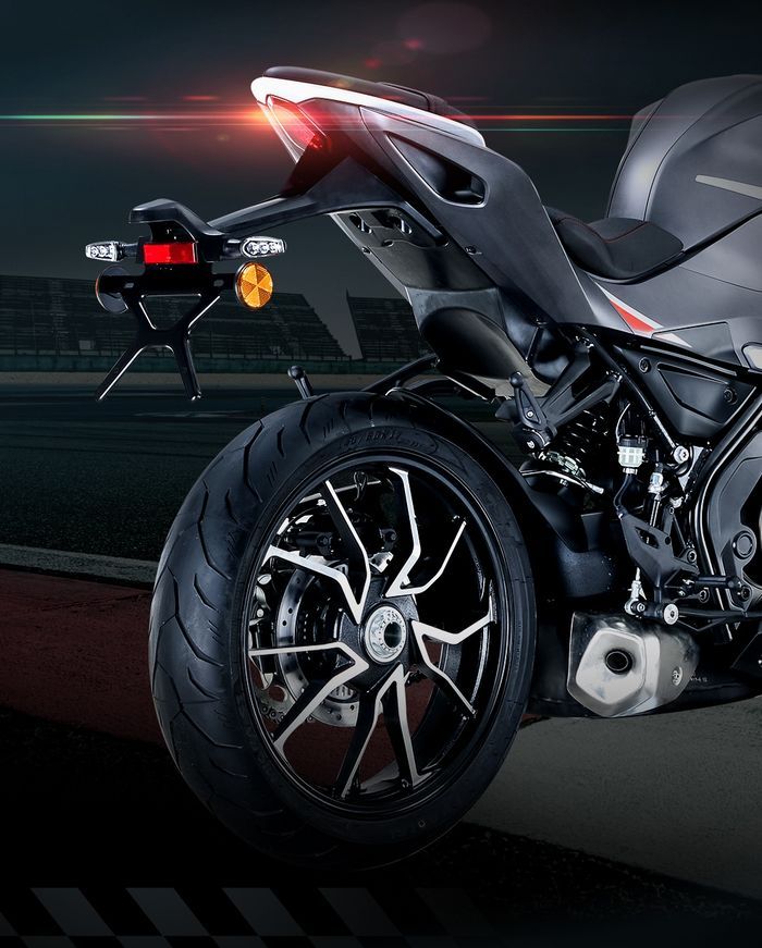 Untuk kaki-kaki menggunakan pelek palang alias racing dengan ban 110/70-R17 di depan dan 140/60-R17 di belakang.